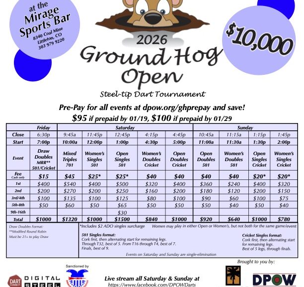 2026 Ground Hog Open The 2026 Ground Hog Open is a steel-tip dart tournament held January 30–February 1 at the Mirage Sports Bar in Littleton, Colorado. Players can compete in a full weekend schedule including singles, doubles, mixed triples, cricket,...