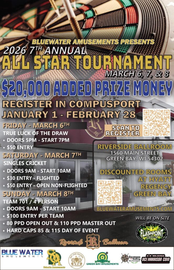 The 2026 7th Annual All Star Tournament, presented by Bluewater Amusements, takes place March 6–8 in Green Bay, Wisconsin. This three-day dart event features a True Luck of the Draw on Friday, Singles Cricket on Saturday, and a 4-person Team 701 event on Sunday. Players will compete for $20,000 in added prize money across multiple formats and skill levels. Registration is handled through Compusport, with discounted hotel rooms available at the Hyatt Regency Green Bay.