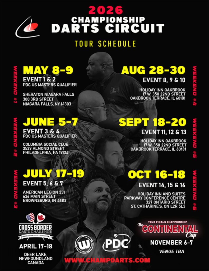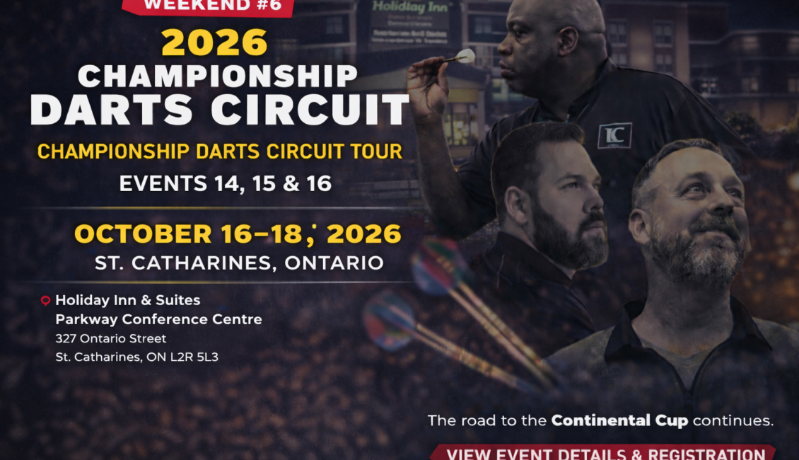 Weekend #6 of the 2026 Championship Darts Circuit heads to St. Catharines, Ontario for three official tour events and a decisive final push toward the Tour Finals and Continental Cup.