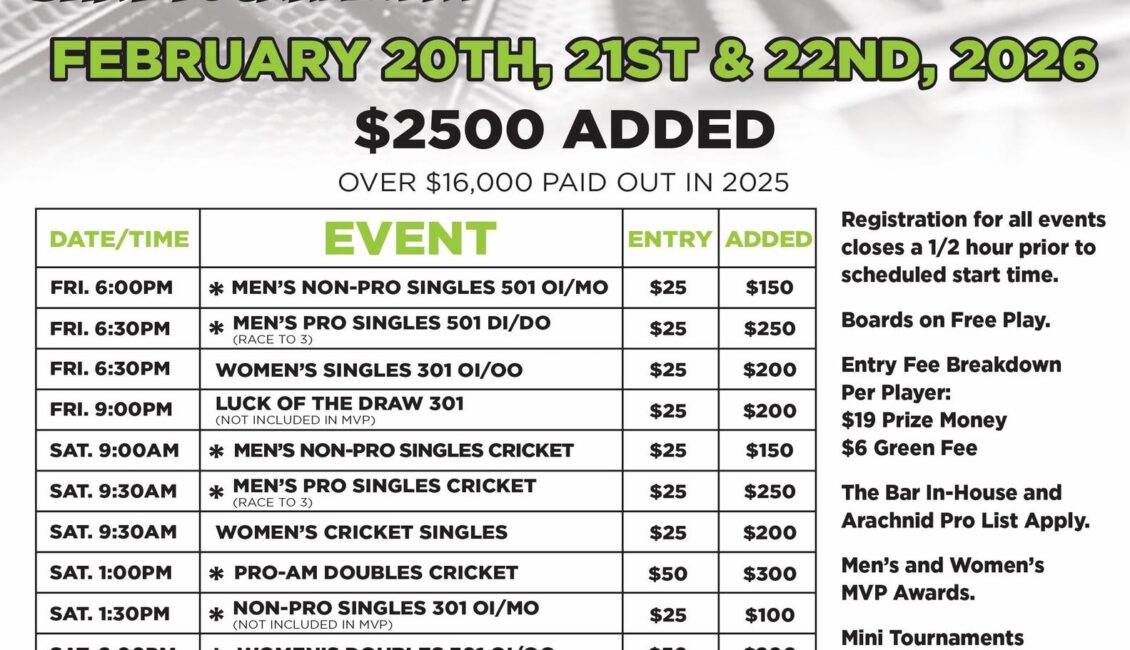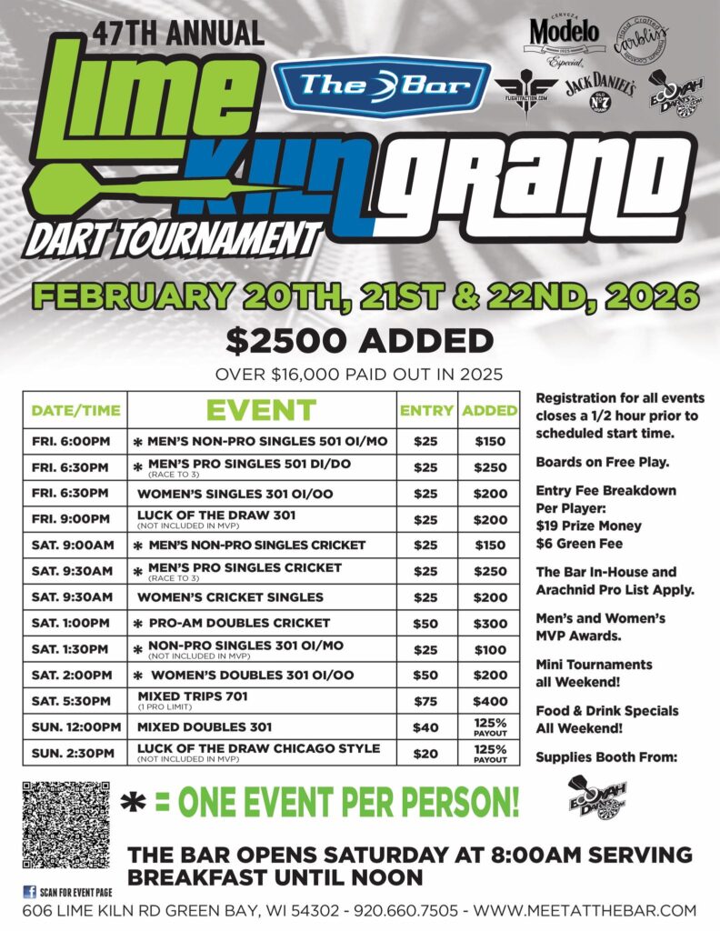 The 47th Annual Lime Kiln Grand Dart Tournament takes place February 20–22, 2026 at The Bar in Green Bay, Wisconsin. This long-running Midwest event features a full weekend of men’s, women’s, mixed, and pro-am competitions in both 501 and cricket formats. With $2,500 added and a strong history of payouts, the Lime Kiln Grand continues to be a marquee stop for players of all levels. Boards will be on free play all weekend along with food and drink specials.