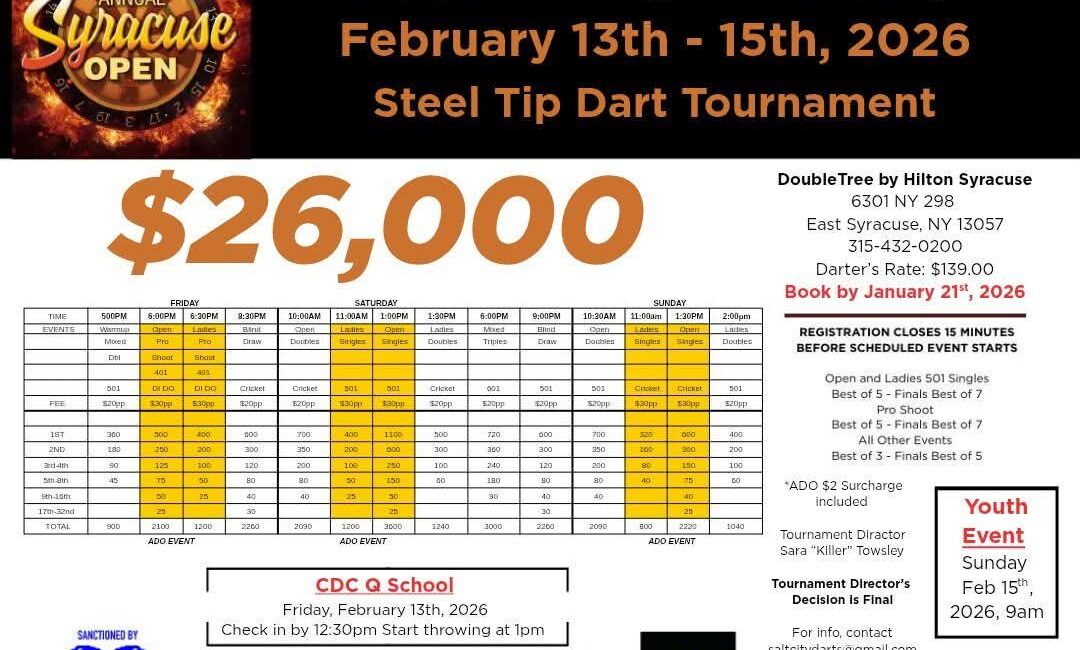 The 47th Annual Syracuse Open returns to East Syracuse, New York from February 13–15, 2026. This steel tip dart tournament features a full weekend of singles, doubles, mixed, blind draw, and triples events. With a total payout of $26,000, players can expect competitive brackets across 501 and Cricket formats. The tournament takes place at the DoubleTree by Hilton Syracuse, with a special darter’s rate available. A youth event is also scheduled for Sunday morning.