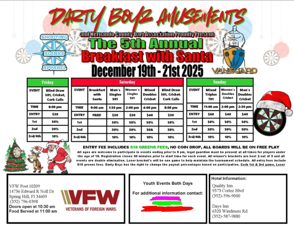 The 5th Annual Breakfast with Santa takes place December 19–21, 2025 at VFW Post 10209 in Spring Hill, Florida. The weekend includes blind draws, singles, doubles, mixed doubles, and mixed triples events across 501, 701, and cricket. Boards will be on free play with no coin drop, and each entry includes $10 greens fees. Breakfast with Santa is featured Saturday morning, and youth events run both days. Scheduled payouts are based on participation and listed per event.