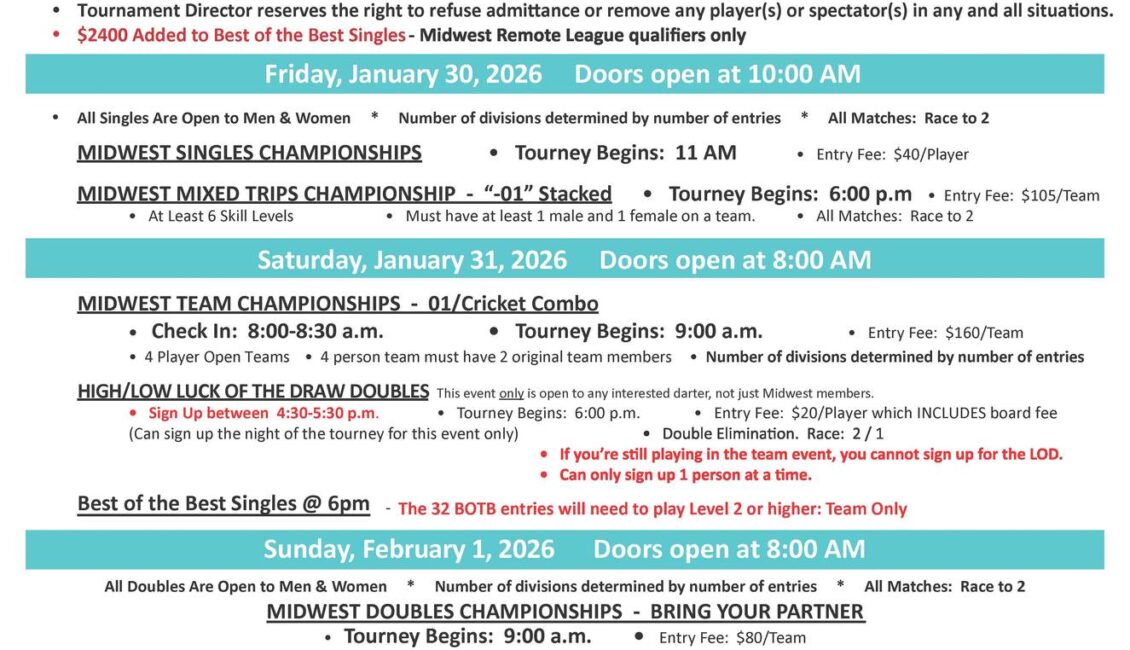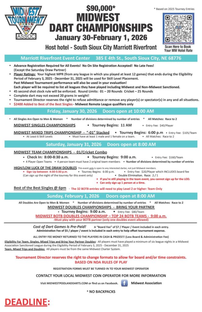 The Midwest Dart Championships will be held January 30–February 1, 2026 in South Sioux City, NE at the Marriott Riverfront Event Center. This major event offers a wide range of competitions including singles, mixed trips, team championships, doubles, and the BOTB Doubles Championship. Players can expect multiple divisions, race-to-2 formats, and events for all skill levels. The flyer advertises $90,000* in total prizes based on 2025 entries, plus $2400 added to Best of the Best Singles. Advance registration is required for all events.