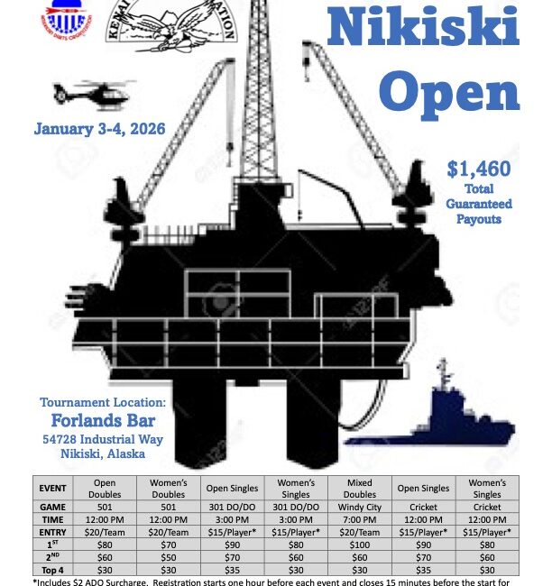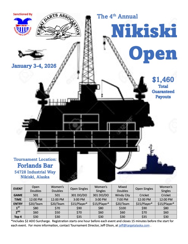 The 4th Annual Nikiski Open takes place January 3–4, 2026 in Nikiski, Alaska. Players will compete in a full weekend of events including singles, doubles, women’s events, mixed doubles, Windy City Cricket, and standard Cricket. The flyer lists $1,460 in total guaranteed payouts. Events run both days at Forlands Bar with registration opening one hour before each event. This tournament is sanctioned by the American Darts Organization and supported by the Kenai Darts Association.