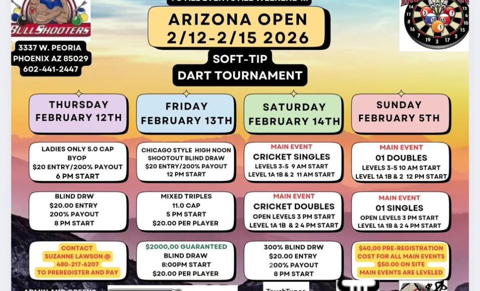 Arizona Open Soft-Tip Dart Tournament Event Summary The Arizona Open Soft-Tip Dart Tournament takes place February 12–15, 2026 in Phoenix, Arizona at Bull Shooters. This multi-day event features a full lineup of main events including cricket and 01 singles and...