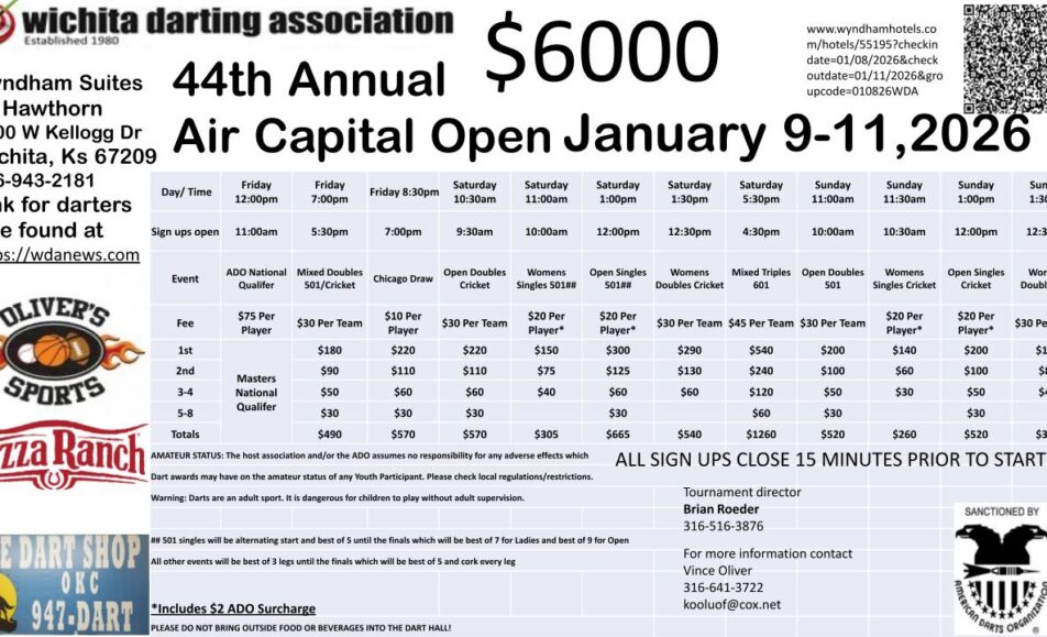 44th Annual Air Capital Open The 44th Annual Air Capital Open returns to Wichita, Kansas, January 9–11, 2026, hosted at the Wyndham Suites by Hawthorn. This event features a full weekend of ADO qualifiers, singles 501 and cricket, doubles, mixed...