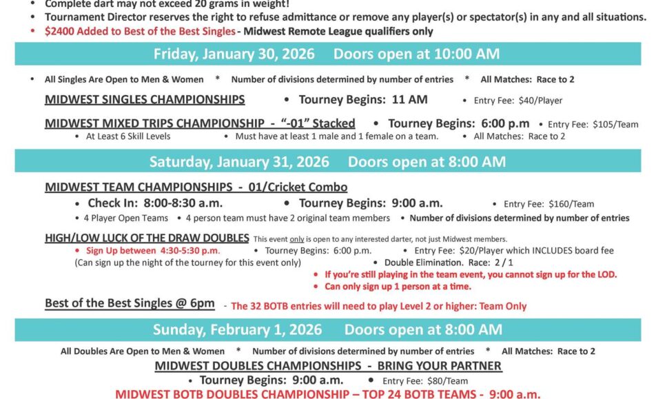 Midwest Dart Championships The Midwest Dart Championships will be held January 30–February 1, 2026 in South Sioux City, NE at the Marriott Riverfront Event Center. This major event offers a wide range of competitions including singles, mixed trips, team championships,...