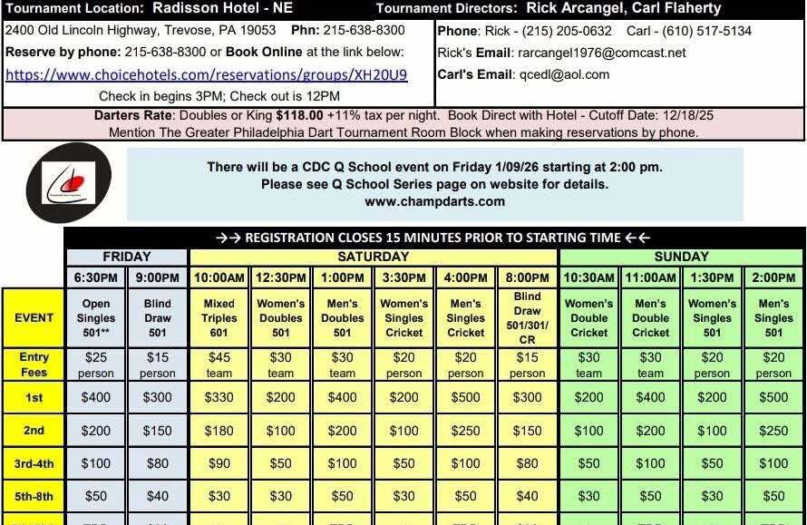Greater Philadelphia Open $10,000 (+) Dart Tournament The Greater Philadelphia Open returns January 9–11, 2026 in Trevose, Pennsylvania at the Radisson Hotel – NE. This three-day tournament showcases a full lineup of singles, doubles, mixed triples, women’s, and men’s events....