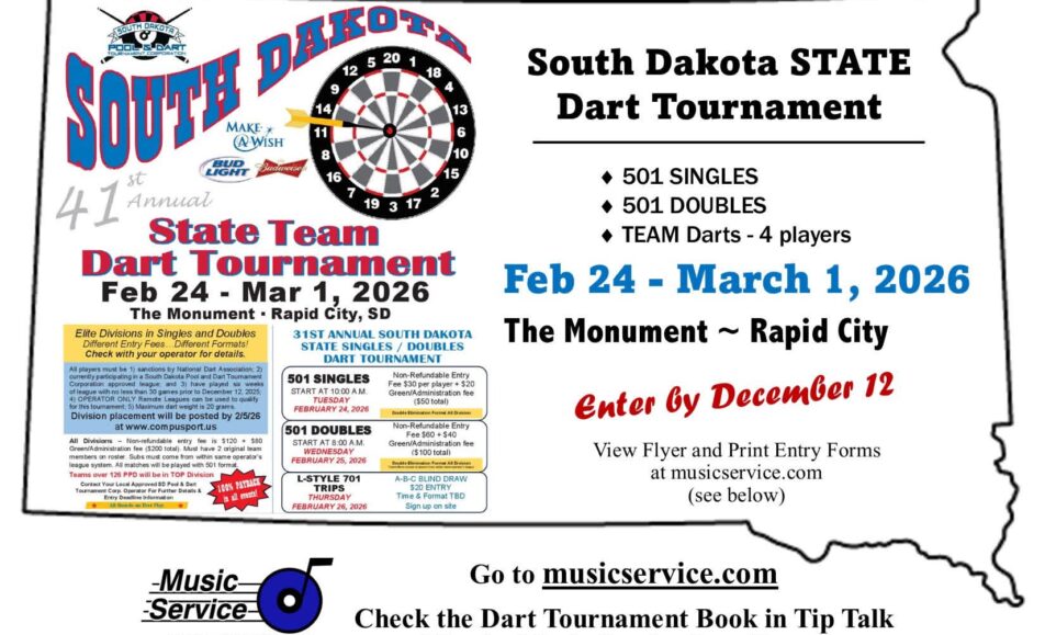 41st Annual State Team Dart Tournament The 41st Annual South Dakota State Team Dart Tournament takes place February 24 through March 1, 2026 in Rapid City, South Dakota. Hosted at The Monument, the event features 501 singles, 501 doubles, and...