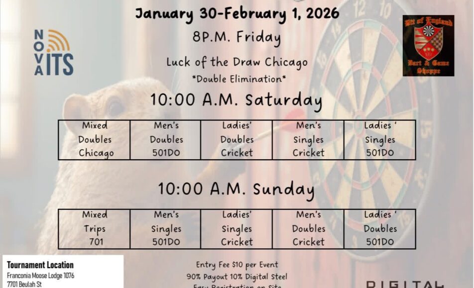 3rd Annual Groundhog Showdown The 3rd Annual Groundhog Showdown takes place January 30–February 1, 2026 in Alexandria, Virginia. Hosted at the Franconia Moose Lodge, the weekend features multiple events including singles, doubles, mixed doubles, and mixed trips across 501, cricket,...