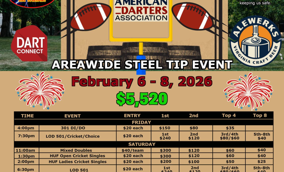 Barrel-Aged Alewerks AreaWide Steel Tip Event The Barrel-Aged Alewerks AreaWide Steel Tip Event takes place February 6–8, 2026 in Williamsburg, Virginia. Hosted by the American Darters Association, this steel tip weekend features a full slate of singles, doubles, and triples...